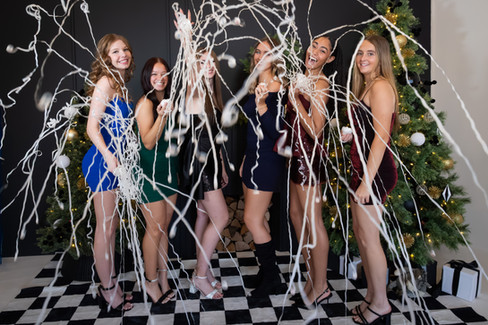 For this session, we created three different holiday-inspired looks in one afternoon. We started with a cozy Christmas morning feel, moved into a dressed-up holiday look, and finished with a New Year’s Eve–inspired setup. Each vignette was thoughtfully planned and styled to feel relaxed and natural, not overly posed or forced. Attendance at additional shoots like this is always optional — I know how busy high school students are — but having the option is part of what makes the experience special.